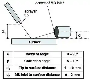 The ionization efficiency of DESI is complex and depends on several parameters such as, surface effects, electrospray parameters, chemical parameters and geometric parameters.[12] Surface effects include chemical composition, temperature and electric potential applied. Electrospray parameters include electrospray voltage, gas and liquid flow rates. Chemical parameters refers to the sprayed solvent composition, e.g. addition of NaCl. Geometric parameters are α, β, d1 and d2 (see figure on the right).
