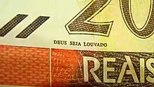 "Deus seja louvado" (In English, "God be praised") is an expression displayed in the left bottom part of all Brazilian real currency banknotes.[1] It exists since the 1980 decade, when the then President of the Republic, José Sarney, openly Catholic,[2] asked the Banco Central (Central Bank) to include the phrase in the cruzado coin. The Federal Government at the time got inspired by theist doctrines of other secular states such as the United States of America that were already using the motto "In God We Trust" in its dollar banknotes.