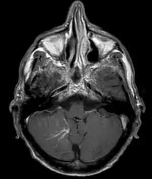 | Developmental venous anomaly in the cerebellum seen on axial contrast-enhanced T1 weighted MRI | |