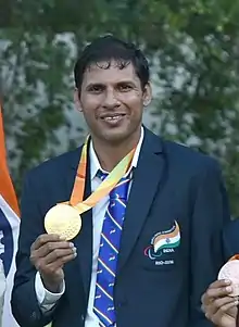 ![]() Devendra Jhajharia with his gold medal from the 2016 Summer Paralympics | |||||||||||||||||||||||||||||||||||