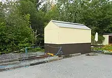 The station is equipped with a water tower, and a station building containing gift shop and booking office. A separate temporary structure in the car park currently serves as the Two Hoots refreshment room on railway operating days.