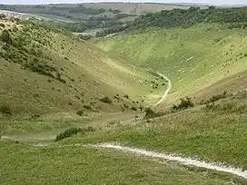 Devil's Dyke is a 100m deep V-shaped dry valley on the South Downs in Sussex in southern England, 5 miles (8.0 km) north-west of Brighton. It is managed by the National Trust, and is also part of the Beeding Hill to Newtimber Hill Site of Special Scientific Interest.[1] Devil's Dyke was a major local tourist attraction in the late 19th and early 20th centuries. It is now a popular viewpoint and site for walking, model aircraft flying and hang gliding.[2] The South Downs Way passes the site.