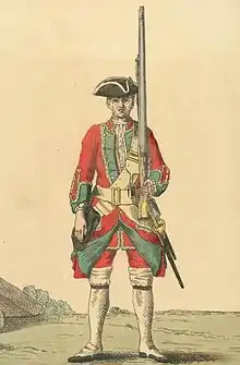 The regiment was deployed to Flanders in summer 1742 for service in the War of Austrian Succession[9] and took part in the Battle of Dettingen in June 1743,[10] the Battle of Fontenoy in May 1745[11] and the Battle of Rocoux in October 1746.[12]
