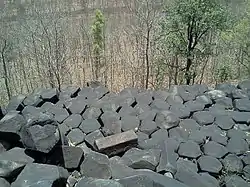 These are a series of hills, situated next to Potla and Pipri villages in Bagli Taluk of Dewas district.[12] There are total seven mountain-like formations of shaped, interlocking, basalt columns that were probably created simultaneously as a result of volcanic eruption millions of years ago. These rock columns are arranged in a pattern that gives an appearance of a man-made structure. Most of the columns are hexagonal and interlocked with similar rocks on all the edges that emit a musical sound when struck.[13] Most visible columns are 8 to 10 feet long but there can be longer rocks further deep inside the mountain. Although basalt columns are not unique and are found at several places around the world (including St. Mary's Islands in Karnataka, India), the quality, quantity, geometrical arrangement and location (far from an ocean) of this place is unique.[14]