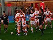 The financial constraints the club was under by this point were so great that incumbent chairman Mark Sawyer had suggested that the side would be better suited to "take a year out" to find its feet financially.[4] The club instead opted to field a side made up predominantly of local amateurs and, under new coach Andy Kelly, found the going tough in 2004, as their final lowly league position suggested. Plus points during an otherwise forgettable season were the return to the club of popular second rower Kevin Crouthers and the 15 tries of half back Adam Thaler.