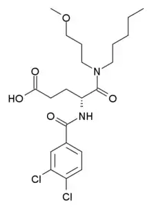 Dexloxiglumide is a drug which acts as a cholecystokinin antagonist, selective for the CCKA subtype. It inhibits gastrointestinal motility and reduces gastric secretions, and despite older selective CCKA antagonists such as lorglumide and devazepide having had only limited success in trials and ultimately never making it into clinical use, dexloxiglumide is being investigated as a potential treatment for a variety of gastrointestinal problems including irritable bowel syndrome,[1] dyspepsia,[2] constipation[3] and pancreatitis,[4][5] and has had moderate success so far although trials are still ongoing.