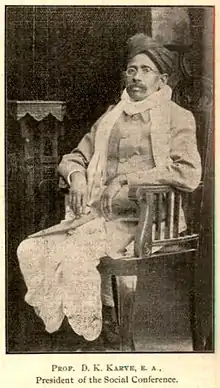 Dhondo Keshav Karve (धोंडो केशव कर्वे)(18 April 1858 – 9 November 1962), popularly known as Maharshi Karve (महर्षी कर्वे), was a social reformer in India in the field of women's welfare. He advocated widow remarriage and he himself married a widow. Karve was a pioneer in promoting widows' education. He founded the first women's university in India - SNDT Women's University .[1] The Government of India awarded him with the highest civilian award, the Bharat Ratna, in 1958, the year of his 100th birthday.