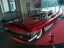 ...an exotic vehicle that is overdone in every detail and in every respect, an iconic dream car. Its metallic red paint was from 30 coats of paint with real ground diamonds for sparkle.[5][6] ...The body is from hand-fashioned soft aluminum. There are hidden headlights and tail lights that swivel as the car turns. Inside, the seats each have their own ash tray, cigarette lighter, and radio speaker. On the dash are oversized levers that control the air conditioning, heater and defroster.[7]
