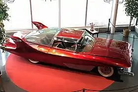 It has a glass cockpit in back, a squared steering wheel resembling a superellipse (with n = 3⁄2, a = b = 1) and thermostatically controlled air conditioning system.[2] The interior is rust colored in contrast to the ruby paintwork. The design included the first backseat-mounted radio loudspeakers and hidden windshield wipers,[4][15] which start themselves when it rains.[1] Other features include retractable headlamps, rear turn signals which swivel as the car turns, 'floating' bumpers and a trunk that was hinged from the driver's side.[4] Each of the four bucket seats have their own thermostatically controlled air conditioning, individual cigarette lighters and ashtrays, as well as a radio loudspeaker.[1] The original engine, a Cadillac V8, was later replaced by a high-performance Ford engine when it was taken on the show circuit.[15]