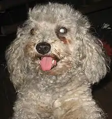 Sometimes, the first sign of diabetes noticed by the owner may be that their dog either has become blind (due to the formation of cataracts in the eyes), or has vomiting, anorexia, lethargy and weakness (due to ketoacidosis).[49] Diabetes mellitus can be a threat to the health of the dog since it may cause urinary tract infections.