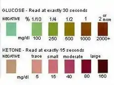When testing urine for ketones, the sample needs to be as fresh as possible. Ketones evaporate quickly, so there is a chance of getting a false negative test result if testing older urine.[127] The urine testing strip bottle has instructions and color charts to illustrate how the color on the strip will change given the level of ketones or glucose in the urine over 15 (ketones–Ketostix) or 30 (glucose–Ketodiastix) seconds.[128] Reading the colors at those time intervals is important because the colors will continue to darken and a later reading will be an incorrect result.[114] Timing with a clock or watch second hand instead of counting is more accurate.[129]