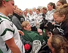 After battling cancer since 1995, Geppi-Aikens learned prior to the 2003 season that the brain tumor had returned and this time it was inoperable.[5] Despite being paralyzed by the cancer and using a wheelchair Geppi-Aikens continued to coach her team to the nation's # 1 ranking.[6][7][8] The Greyhounds advanced to the Final Four of the NCAA Women's Lacrosse Championship tournament before their season ended with a 5–3 loss.[9]
