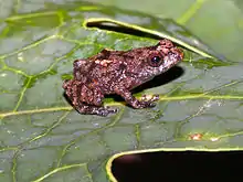 Diasporus anthrax is a species of frogs in the family Eleutherodactylidae. It is endemic to Colombia where it is found along the eastern base of the Cordillera Central and the western slope of the Cordillera Oriental.[3] The specific name anthrax is Greek for Greek, meaning a carbuncle, a red gemstone. It refers to the red patches on the hidden surfaces of the limbs.[2]