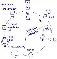 Vegetative cells of diatoms are diploid (2N) and so meiosis can take place, producing male and female gametes which then fuse to form the zygote. The zygote sheds its silica theca and grows into a large sphere covered by an organic membrane, the auxospore. A new diatom cell of maximum size, the initial cell, forms within the auxospore thus beginning a new generation. Resting spores may also be formed as a response to unfavourable environmental conditions with germination occurring when conditions improve.[28]