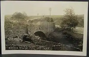 ![]() A 1925 postcard showing the wrecked coach at the base of Dibbles Bridge | |