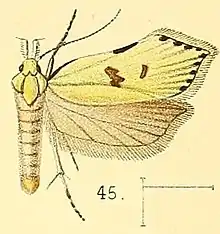 The wingspan is 15–16 mm. The forewings are pale olive-green with a small brown streak along the extreme base of the costal margin, followed by a few brown scales on the convex part of the margin near the basal third of the wing-length. There is a distinct dark brown narrow line-like spot along the extreme costal margin, scarcely beyond the middle, and a few brown scales in the cilia of the pre-apical costal projection. There is a reduplicated brown spot just before the middle of the wing, the upper portion of which is almost round, while the lower portion is triangular, with the apex pointing outwards. At the lower angle on the fold is a roundish spot of a darker brown and there is an obliquely-placed linear spot of dark brown scales at the end of the cell, as well as five small spots of the same colour at the extreme edge along the apical margin, with three similar spots above the apex, between it and the costal projection. Two similar spots also occur on the dorsal margin. The hindwings are pale greyish brown.[3]
