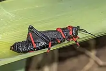 Dictyophorus spumans, the koppie foam grasshopper or rooibaadjie, is a species of grasshopper in the family Pyrgomorphidae indigenous to Africa. The name "foaming grasshopper" derives from the insect's ability to produce a toxic foam from its thoracic glands.[2] It is closely related to Phymateus.