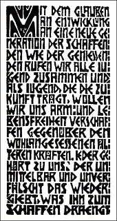 The Brücke aimed to eschew the prevalent traditional academic style and find a new mode of artistic expression, which would form a bridge (hence the name) between the past and the present.[4] They responded both to past artists such as Albrecht Dürer, Matthias Grünewald and Lucas Cranach the Elder, as well as contemporary international avant-garde movements.[4] The group published a broadside called Programme in 1906, where Kirchner wrote: