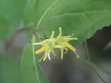Northern bush honeysuckle is a deciduous shrub, reaching a maximum height between 0.6 and 1.2 metres.[1] This particular species is known for the following characteristics: branches lying close to the ground, fibrous roots, pale yellow flowers, and dry, woody fruit. Northern bush honeysuckle's simple leaves are placed in an opposite arrangement. As the seasons change, so do the leaves' colours: initially green, the leaf gradually deepens to a dark red.[2] The flowers are in full bloom between early July and early August; the woody seeds are fully matured by September in preparation for dispersal.