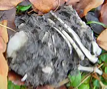 Upon capture, small prey like shrews and rodents are often swallowed whole, while others may be torn into pieces. Often prey is dismembered in order to more easily ingest it whole, i.e. decapitating mice, removing the legs from frogs while birds like sparrows are also regularly decapitated (with the head often eaten separately) and nearly all avian prey is plucked before being consumed.[7][28][29][30] One tawny owl was observed to eat a squirrel by leaving the head intact and peeling the skin back from the neck, apparently leaving bones in place while consuming the flesh.[31] Indigestible items, including fur, feathers, bones (which sometimes visibly protrude out of the peller), sometimes intestines and invertebrate carapaces, are regurgitated in large pellets, that can be anywhere in typical size from 20.3 to 67 mm (0.80 to 2.64 in) long with a diameter of 17 to 30 mm (0.67 to 1.18 in). The pellets are typically grey coloured and are found in groups under trees used for roosting or nesting. At least some tawny owl pellets can measure up to 84 mm (3.3 in) long and can include large objects such as an intact 10 cm (3.9 in) bill of a snipe.[7][1][29][32] Undigested material coughed up often reveals different prey than pellets.[7] Estimated daily food requirements for a tawny owl is 73.5 g (2.59 oz), which is proportionately lower (at about 14% of their own body mass) than the estimates for other medium-sized owls in Europe (at 23–26% of their own body mass), therefore tawny owls can appear to live off of relatively little food quite efficiently.[33]