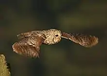 The tawny owl (Strix aluco) is an opportunistic and generalized predator. Peak hunting activity tends to occur largely between dusk to midnight, with owls often following an erratic hunting pattern, perhaps to sites where previous hunts were successful.[1][2] When feeding young, hunting may need to be prolonged into daylight in the early morning.[3][4][5] Based on hand-reared young owls that re-released into the wild, hunting behaviour is quite innate rather than learned.[6] Normally this owl hunts from a perch.[7][8][1] Perching bouts usually last from about 8 to 14 minutes depending largely on habitat.[2] Tawny owl's hunting from a perch or pole can recall a buzzard and the two take similar prey sizes as well. However, high initial speed and maneuvering among trees and bushes with great dexterity may allow it to surprise relatively large prey, more like a goshawk.[7][8] The tawny owl is capable of lifting and carrying off in flight individual prey weighing up to at least 320 g (11 oz).[9] Their middle talon, the most enlarged claw on owls, measures an average of 19.1 mm (0.75 in). While not as large as those of the Ural owl, the talons are extremely sharp, stout and quite decurved. The claws are considered to be visibly more overdeveloped than those of other European mid-sized owls and the footspan including the claws is fairly larger as well, at an average of about 13.4 cm (5.3 in).[7][10][11] The hunting owl often extends its wings to balance and control prey upon impact.[12] Alternatively, this species may hunt from flight. This occurs from 2 to 3 m (6.6 to 9.8 ft) over the ground, often over open habitats such as bushes, marsh or grassland, forming a quartering or zigzag pattern over the opening. During these flights they cover about 30 to 50 m (98 to 164 ft) before changing direction.[13] Hunting from flight was surprisingly prevalent in a Swedish study of two radio-tagged birds, with 34% of study time spent hunting from flight while 40% of the study time was spent on hunting from a perch.[13] In a similar study in England, less than 1% of time was spent hunting from flight.[2] In a more deliberate variation of hunting from flight, the hunting owl may examine crags and nest boxes or also hover around prey roosts. In the latter type of hunts, the tawny owls may strike branches and/or beat their wings together in front of denser foliage, bushes or conifers in order to disturb and flush prey such as small birds and bats, or may dive directly into said foliage.[7][12][14][15] Hovering has also been recorded in differing circumstances, including one incidence of an owl hunting a small bird that was caught on the wing after a hovering flight.[16][17] Tawny owls have also taken bats on the wing as well (such as ones snatched from near streep lamps when attempting to hunt themselves) and have been seen to hawk large, relatively slow-flying insects such as some beetles and moths in flight.[7][14] Caterpillars may too be taken from trees.[14] Usually these hunting variations are correlated with poor weather hampering the capture of preferred prey.[1][18] Tawny owls eat worms with relative frequency, as they often hear them apparently from below the surface and snatch them up from shallow dirt or below leaf litter. Their worm-hunting style recalls worm hunting techniques by most other birds and they were recorded to eat 0.39 worms per minute during an hour of observation in England and were sometimes seen to feed on worms during daylight.[7][19][20][21] Other hunting from the ground has been observed, often of insects such as beetles, but tawny owls have also been reported to "leap" upon from a ground vantage point in order to capture a vole, quite like foxes often do.[7][22][23] There are now many accounts of tawny owls feeding on carrion from a wide range of sources, including hares, rats, sheep, and trout.[24][25][26][27]