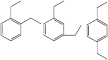 ![]() The three isomers of diethylbenzene: ortho-, meta-, and para-diethylbenzene (left to right) | |