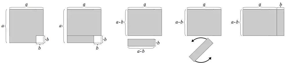 Another geometric proof proceeds as follows: We start with the figure shown in the first diagram below, a large square with a smaller square removed from it. The side of the entire square is a, and the side of the small removed square is b. The area of the shaded region is . A cut is made, splitting the region into two rectangular pieces, as shown in the second diagram. The larger piece, at the top, has width a and height a-b. The smaller piece, at the bottom, has width a-b and height b. Now the smaller piece can be detached, rotated, and placed to the right of the larger piece. In this new arrangement, shown in the last diagram below, the two pieces together form a rectangle, whose width is and whose height is . This rectangle's area is . Since this rectangle came from rearranging the original figure, it must have the same area as the original figure. Therefore, .