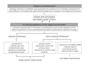 Digital constitutionalism is a concept used in the context of research investigating the impact of digital technology on constitutional values and principles. As for the notion of constitutionalism, this concept has not received a univocal definition, having been referred to a movement, a set of instruments and an ideology. The notion of digital constitutionalism emerged in the context of the digital revolution that characterised the first decades of the Twenty First century. Current research is conducted by scholars from various disciplines, including law, communication studies, philosophy and political science. It focuses on the instruments and actors involved in promoting constitutional values and principles which are fit for the digital age.