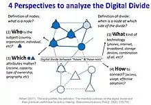 There are manifold definitions of the digital divide, all with slightly different emphasis, which is evidenced by related concepts like digital inclusion,[20] digital participation,[21] digital skills,[22] media literacy,[23] and digital accessibility.[24]