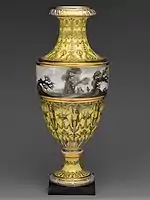 The wares were of very high quality, in styles similar to Sèvres, following the movement of fashion from Neoclassicism to the Empire style.[3] The Empress Joséphine commissioned a service in 1811, with Dutch Golden Age paintings of genre subjects, in gilded Neoclassical settings, a somewhat surprising combination already used by Sèvres before the Revolution.[4] A particular speciality was vases which imitated polished stone or tortoiseshell in porcelain, some in the slim fuseau shape and mounted with ormolu.[5]