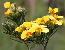 This species is a spreading or erect shrub to 2 metres in height with cylindrical leaves to 2.5 cm long, with a short, often recurved apex.[2] The bright yellow pea flowers have red markings and are proportionately quite wide.[2] These appear in dense clusters at the end of the wiry branchlets from August to December (late winter to early summer) in its native range.[2] It bears 4−6mm long pods with sparse hairs.[2][3]