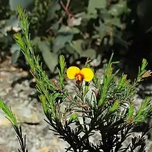 Dillwynia glaucula, commonly known as Michelago parrot-pea,[2] is a species of flowering plant in the family Fabaceae and is endemic to south-eastern New South Wales. It is an erect shrub with lenticels on the stems, linear, grooved leaves and yellow flowers with red markings.