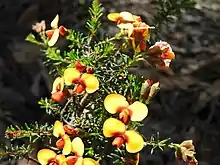 Dillwynia phylicoides, commonly known as small-leaf parrot-pea,[2] is a species of flowering plant in the family Fabaceae and is endemic to eastern Australia. It is an erect to open shrub with twisted, linear to narrow oblong leaves, and yellow and red flowers.