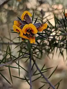 Dillwynia sieberi, commonly known as Sieber's parrot-pea,[2] is a species of flowering plant in the family Fabaceae and is endemic to eastern Australia. It is an erect shrub with rigid, needle-shaped, sharply-pointed leaves and yellow to yellow-orange flowers with reddish-brown markings.