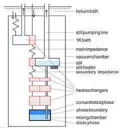 In the mixing chamber, two phases of the 3He–4He mixture, the concentrated phase (practically 100% 3He) and the dilute phase (about 6.6% 3He and 93.4% 4He), are in equilibrium and separated by a phase boundary. Inside the chamber, the 3He is diluted as it flows from the concentrated phase through the phase boundary into the dilute phase. The heat necessary for the dilution is the useful cooling power of the refrigerator, as the process of moving the 3He through the phase boundary is endothermic and removes heat from the mixing chamber environment. The 3He then leaves the mixing chamber in the dilute phase. On the dilute side and in the still the 3He flows through superfluid 4He which is at rest. The 3He is driven through the dilute channel by a pressure gradient just like any other viscous fluid.[5] On its way up, the cold, dilute 3He cools the downward flowing concentrated 3He via the heat exchangers and enters the still. The pressure in the still is kept low (about 10 Pa) by the pumps at room temperature. The vapor in the still is practically pure 3He, which has a much higher partial pressure than 4He at 500–700 mK. Heat is supplied to the still to maintain a steady flow of 3He. The pumps compress the 3He to a pressure of a few hundred millibar and feed it back into the cryostat, completing the cycle.