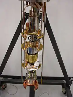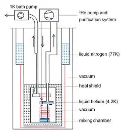 A 3He/4He dilution refrigerator is a cryogenic device that provides continuous cooling to temperatures as low as 2 mK, with no moving parts in the low-temperature region.[1][2] The cooling power is provided by the heat of mixing of the Helium-3 and Helium-4 isotopes.