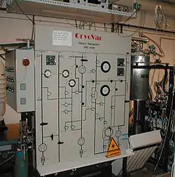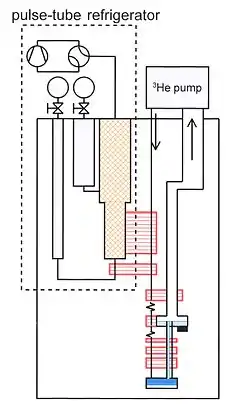 Modern dilution refrigerators can precool the 3He with a cryocooler in place of liquid nitrogen, liquid helium, and a 1 K bath.[6] No external supply of cryogenic liquids is needed in these "dry cryostats" and operation can be highly automated. However, dry cryostats have high energy requirements and are subject to mechanical vibrations, such as those produced by pulse tube refrigerators. The first experimental machines were built in the 1990s, when (commercial) cryocoolers became available, capable of reaching a temperature lower than that of liquid helium and having sufficient cooling power (on the order of 1 Watt at 4.2 K).[7] Pulse tube coolers are commonly used cryocoolers in dry dilution refrigerators.