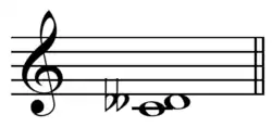 In modern Western tonal music theory, a diminished second is the interval produced by narrowing a minor second by one chromatic semitone.[1] It is enharmonically equivalent to a perfect unison.[3] Thus, it is the interval between notes on two adjacent staff positions, or having adjacent note letters, altered in such a way that they have no pitch difference in twelve-tone equal temperament. An example is the interval from a B to the C♭ immediately above; another is the interval from a B♯ to the C immediately above.