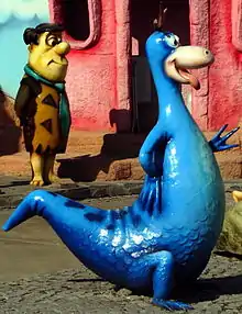 Dino ( /ˈdiːnoʊ/) is a fictional character featured in the Hanna-Barbera animated television series The Flintstones, and its spin-offs and feature films. He is a pet dinosaur of the series' main characters, Fred and Wilma Flintstone.[9] Dino debuted in the opening credits of the pilot episode of The Flintstones, but is not mentioned by name until the first season's fourth episode, "No Help Wanted". Dino was voiced by voiceover actor Mel Blanc from 1960 to 1989.[10]