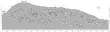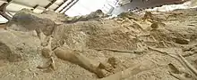 The "Wall of Bones" located within the Dinosaur Quarry building in the park consists of a steeply tilted (67° from horizontal) rock layer which contains thousands of dinosaur fossils. The preserved section is only a portion of what was originally present when Douglass made his discovery as seen on the map above. When work ceased in 1922, a portion of the quarry was left for future development. This work began as part of President Franklin Roosevelt's Civil Works Administration, which provided employment during the Depression under the Transient Relief Service and later under the Works Progress Administration.[16] This work included constructing a road to the quarry, removal of overburden covering the bone-bearing strata, and building of a small, temporary museum. The War interrupted work but this was resumed in 1951 with the building of a small metal building over the east portion of the quarry to test whether bone was abundant enough to warrant a larger, more permanent building. This more permanent building was erected in the mid-1950s as part of the National Park Service Mission 66 plan. The architectural design was high controversial for its ultra-modern use of glass, steel and concrete ramp that spiraled around a cylindrical office tower. The building opened at the dedication ceremony on June 1, 1958.[17] The design had two levels and abundant natural light so that visitors could watch technicians remove the hard rock to reveal the fossil bones in-situ.