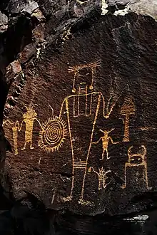 The fate of the Fremont culture is unclear. Recent theories suggest that the Fremont’s lifestyle may have changed due to drought or other climate factors, dwindling natural resources, or the influence of other neighboring cultures.[8] They left evidence of their presence in the form of petroglyphs and pictographs of human and animal figures, and abstract designs. Human figures typically have trapezoidal bodies and elaborate decorations that suggest headdresses, earrings, necklaces, or shields. The animal figures include bighorn sheep, birds, snakes, and lizards. Purely abstract or geometric designs, such as circles, spirals, and various combinations of lines, are common. Many designs in the monument are accessible for close viewing, along four trails in Utah, one of which is near the visitor center, and a fifth trail in Colorado.[9]