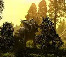 In 1966 John Ostrom postulated that the diet of late Cretaceous chasmosaurs such as Triceratops and Torosaurus fed on very resistant and fibrous materials like the fronds of cycad or palm plants.[20] By extension, all Ceratopsids had a shearing dentition and efficient, powerful jaw mechanics that allowed them to feed on tough vegetation. Mallon and Anderson postulated that Ankylosaurs and Ceratopsids may have partitioned the herb layer in the Dinosaur Park Formation, or that Ceratopsid feeding height was slightly higher.[21] As well as suggesting that the Ornithopods might have made room for the passing Ceratopsid herds by rising up to avoid ecological competition. Notably, they could not distinguish centrosaurine and chasmosaurine ecology apart, though it is likely present as in other megaherbivore clades.[22] The results of a NPMANOVA analysis supported the suggestion that Ceratopsids had the strongest bite force of each of the megaherbivore groups, and able to process the toughest plants available.[23] Like Ornithopods and unlike all other dinosaurs, Ceratopsians possessed dental batteries that may have been attributable to their success. In 2019, Mallon noted that stratigraphic overlap in the Dinosaur Park Formation between subfamilial taxa was limited, further supporting chasmosaurine and centrosaurine preferencial differences.[23]