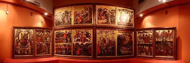 The largest part of the collections are Gothic sculptures from the churches of the former Diocese of Kulm renamed in 1925 as the Bishopric of Pelplin, and also from the Roman Catholic Diocese of Toruń. Late Gothic paintings of "Crucifixion" from Lignowy (gilded with gold leaf),[1] "Flagellation" (1380), and "Descent from the Cross" (1495) from the Cathedral Basilica of St. John the Baptist and John the Evangelist in Toruń, are supplemented with original art by Hermann Hahn (1570–1628) and Andreas Stech (1635–1697).[2] The museum received generous financial support from the Ministry of Culture and National Heritage for the preventive conservation of paintings from 1420 to 1695.[3]