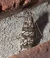The wingspan is 27–32 mm. The forewings are dark gray to brown to nearly black and are boldly patterned with multiple contrasting white patches and zig-zag crossbands. The hindwings are light gray to tan. There are one to four generations per year, with adults on wing from early April to early November.[5]