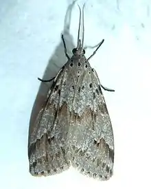 The length of the forewings is 13–16 mm. Adults are cream coloured with brown mottling and darker shades as well as a few black dots in the basal, medial and post medial areas on the forewings.