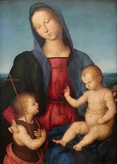 The physiognomy and composition still draw heavily on Perugino. Roberto Longhi noted the more archaic painting of the Madonna compared to the work on the Christ Child and John the Baptist, leading him to theorise that it had been worked on around 1500–1502, abandoned and then completed in Florence around 1504–1505.[3]