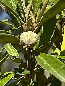 Diplolaena microcephala, commonly known as lesser diplolaena,[2] is a rounded, spreading shrub about 1.5 m (4 ft 11 in) high and similar width. The grey-green leaves are elliptic shaped, margins folded inwards, up to 30–40 mm (1.2–1.6 in) long on a petiole 2–4 mm (0.079–0.157 in) long. The leaf upper surface is sparsely covered with large rusty coloured star-shaped hairs, the underside moderately covered with stiff, large rusty coloured star shaped hairs. The outer bracts are egg-shaped to triangular, 6–10 mm (0.24–0.39 in) long, covered with short, soft, rusty coloured hairs. The inner bracts narrowly oblong to narrowing triangular, slightly longer than outer bracts. The pendulous flowers are 25 mm (0.98 in) across, with prominent stamens 15–20 mm (0.59–0.79 in) long and vary in colour from red-green, red-orange or pinkish and are borne at the end of branches. Flowering occurs sporadically throughout the year.[3][4][5]