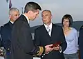 The Montenegro Minister of Defense and a U.S. Navy officer exchange gifts in 2007 during a reception to mark the first year of Montenegro's independence.