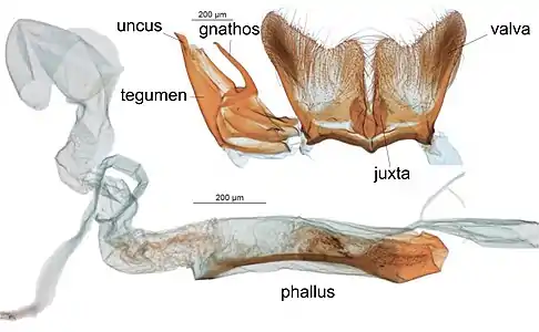 Regarding the genitalia of the male, the elongated uncus that is fused with the tegumen is a unique diagnostic character. In the female, the copulatory bursa is adorned with two sclerotized elements (the signa bursae) – one of which is very large and crescent- or boomerang-shaped, while the other is small, elongated-rounded, and folded. This morphology is not found in any other species of the genus Diptychophora.[1]