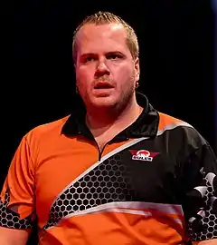 Dirk van Duijvenbode (born 30 June 1992) is a Dutch professional darts player who plays in Professional Darts Corporation (PDC) events. He is known for his energetic walk-on, combined with hardstyle music. More recently, he has become known for his job with an aubergine company, which has led to him having the nickname 'Aubergenius'.[3][4]